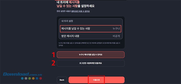 Đầu tiên, bạn sẽ được hỏi về đối tượng có thể gửi lời nhắn đến cây thông của mình. Chọn lựa chọn số 1 để mở quyền cho tất cả mọi người, hoặc chọn số 2 nếu chỉ muốn những người đã đăng nhập tài khoản mới có thể gửi tin. Sau khi chọn, nhấn nút đỏ.