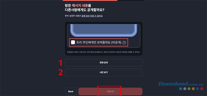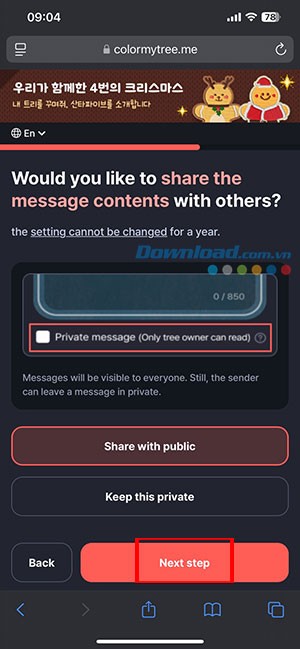 Tiếp theo, hệ thống sẽ hỏi bạn có muốn công khai nội dung tin nhắn hay không. Chọn tùy chọn số 1 để hiển thị đầy đủ nội dung tin nhắn cho bất kỳ ai truy cập cây thông của bạn. Nếu muốn giữ riêng tư, hãy chọn số 2. Nhấn nút màu đỏ sau khi đã quyết định.