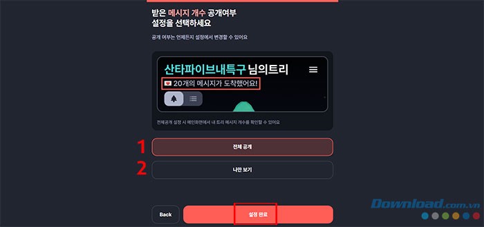 Cuối cùng, bạn cần chọn cách hiển thị số lượng tin nhắn nhận được. Lựa chọn số 1 để hiển thị công khai, hoặc số 2 để chỉ bạn mới xem được. Sau đó, nhấn nút đỏ để hoàn tất.