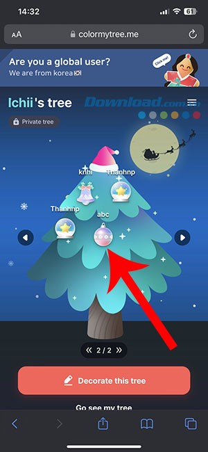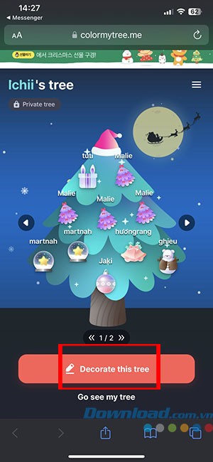 Bước 1: Khi đã có đường dẫn đến cây thông Noel, người nhận có hai lựa chọn: Decorate this tree và Go to see my tree. Hãy chọn Decorate this tree để bắt đầu gửi lời chúc.