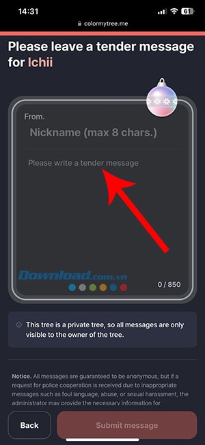 Bước 4: Nhập Nickname của bạn (tối đa 8 ký tự) và viết lời chúc Giáng Sinh ý nghĩa vào ô Please write a tender message.