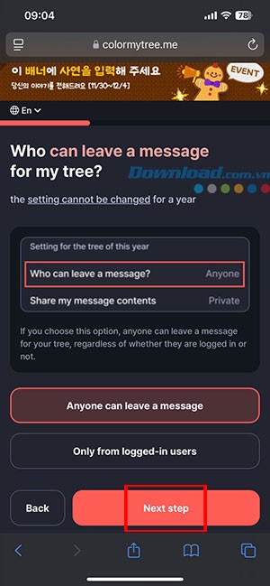 Bước 3: Xác định đối tượng được phép gửi lời chúc trên cây thông của bạn. Chọn Anyone can leave a message để mở quyền cho tất cả mọi người, hoặc chọn Only from logged-in user để giới hạn chỉ những người dùng đã đăng nhập Colormytree mới có thể gửi lời nhắn. Sau đó, nhấn Next step.