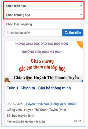 Bước 2: Tiến hành chọn các điều kiện lọc bài giảng, bao gồm Môn học, Chương học, Bài giảng và Từ khóa. Việc này giúp thu hẹp phạm vi tìm kiếm và nhanh chóng tìm thấy bài giảng phù hợp. Sau khi chọn xong, nhấn nút Tìm kiếm.