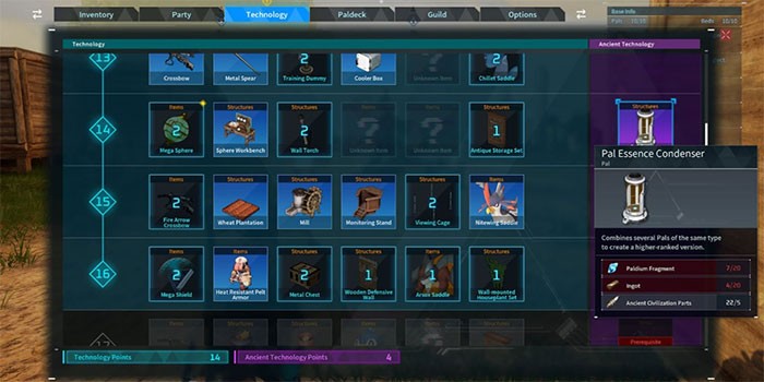 Để tiến hành hợp thể Pal trong Palworld, người chơi trước tiên cần mở khóa và xây dựng thiết bị Pal Essence Condenser. Khả năng tiếp cận công nghệ này được mở khóa trong mục Ancient Technology sau khi đạt đến cấp độ 14. Tuy nhiên, người chơi cũng cần 2 Ancient Technology Point để có thể mở khóa công trình này.