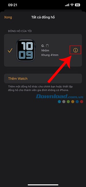 - Nhấn vào biểu tượng thông tin (dấu "i" tròn) bên cạnh Apple Watch bạn muốn hủy ghép đôi.