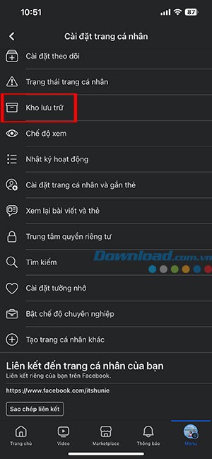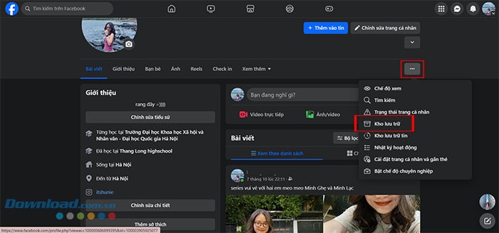 Bước 3: Trong danh mục các cài đặt liên quan đến trang cá nhân, hãy chọn mục Lưu trữ.