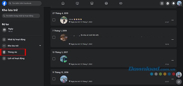 Bước 4: Nhấn vào Thùng rác trên trang Kho lưu trữ. Sau đó, tìm kiếm bài đăng mà bạn muốn khôi phục và chọn ô vuông tương ứng bên cạnh bài đăng đó. Cuối cùng, nhấn nút Khôi phục để bài viết được hiển thị trở lại trên trang cá nhân của bạn.