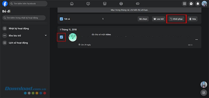 Bước 4: Xác định bài đăng mà bạn mong muốn khôi phục. Đánh dấu vào ô chọn tương ứng với bài viết đó, rồi nhấp vào tùy chọn Khôi phục.