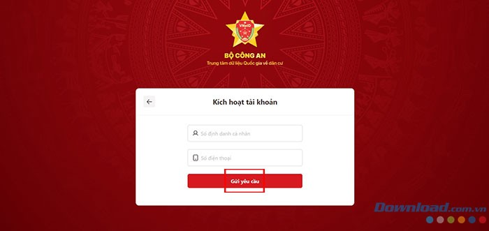 Bước 2: Trong cửa sổ Kích hoạt tài khoản hiện ra, người dùng cần nhập chính xác Số định danh cá nhân và Số điện thoại đã được sử dụng khi đăng ký định danh. Tiếp theo, nhấn vào nút Gửi yêu cầu để tiếp tục.