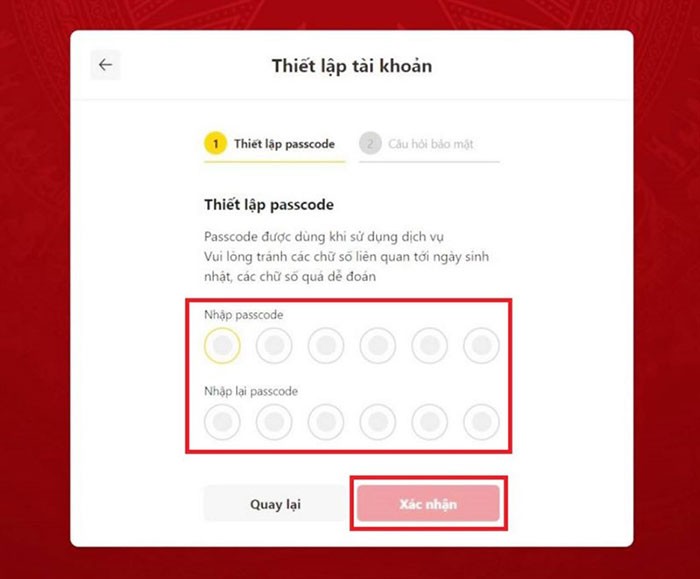 Bước 6: Tiếp tục, người dùng cần thiết lập Câu hỏi bảo mật. Hệ thống sẽ cung cấp một danh sách các câu hỏi có sẵn, bạn hãy chọn 2 câu hỏi và nhập câu trả lời tương ứng. Hãy ghi nhớ chính xác các đáp án, vì hệ thống sẽ phân biệt chữ hoa và chữ thường. Sau đó, nhấn Xác nhận.