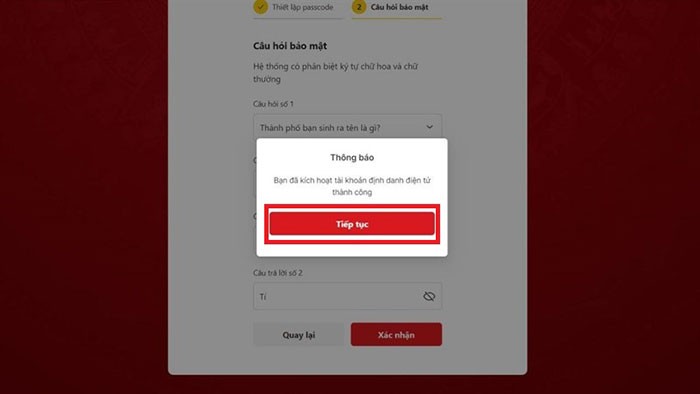 Bước 7: Một thông báo sẽ hiển thị, bạn cần nhấn Tiếp tục để hoàn tất thủ tục kích hoạt tài khoản định danh điện tử trên máy tính.