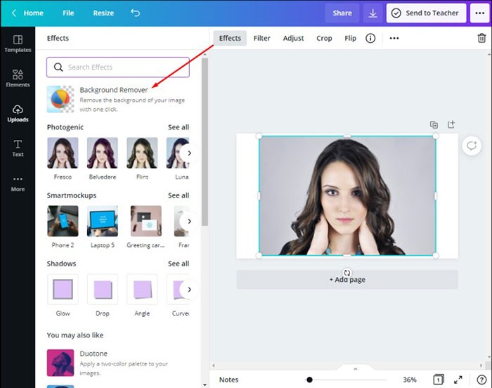 Bước 2: Tiếp theo, bạn cần loại bỏ lớp nền hoặc màu sắc hiện tại của hình ảnh. Hãy nhấp vào mục Effects nằm ở góc trên cùng của thanh công cụ, rồi chọn Background Remover. Sau khi thực hiện, lớp nền của hình ảnh sẽ bị xóa, cho phép bạn tạo ra một thiết kế trong suốt.