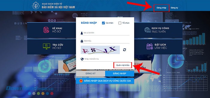 Để tiến hành lấy lại mật khẩu, bạn đầu tiên cần truy cập Cổng dịch vụ công Bảo hiểm xã hội Việt Nam . Sau đó, hãy nhấp chọn vào mục Đăng nhập, rồi tiếp tục chọn Quên mật khẩu.