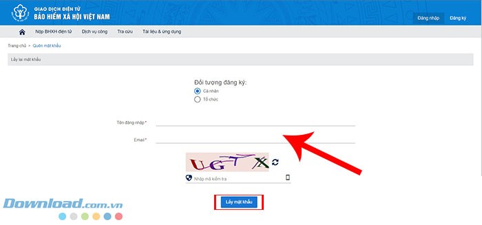 Bước tiếp theo, bạn sẽ cần cung cấp một số thông tin cá nhân. Hãy nhập chính xác Tên đăng nhập (tức là mã số BHXH của bạn), địa chỉ Email đã đăng ký, và Mã kiểm tra hiển thị trên màn hình. Cuối cùng, nhấn vào nút Lấy mật khẩu để tiếp tục.