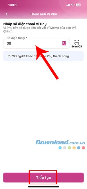 Bước 3: Nhập Số điện thoại của thành viên gia đình mà bạn muốn thêm vào làm Ví Phụ, sau đó ấn Tiếp tục. Ví Phụ này sẽ được liên kết trực tiếp với Ví MoMo của Ví Chính.