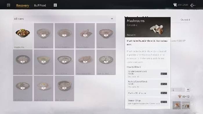 | Wine Mushrooms | 41 | 3 Mushrooms, 3 Meat Scrap | Hồi phục 22.500 HP trong vòng 3 giây. | 4 | Mua tại cửa hàng Meow Meow Temple Shop - Kaifeng. |