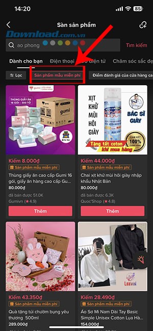 Bước 5: Trong giao diện Sàn sản phẩm, chọn mục Sản phẩm mẫu miễn phí. Một danh sách các sản phẩm dùng thử miễn phí sẽ được hiển thị.