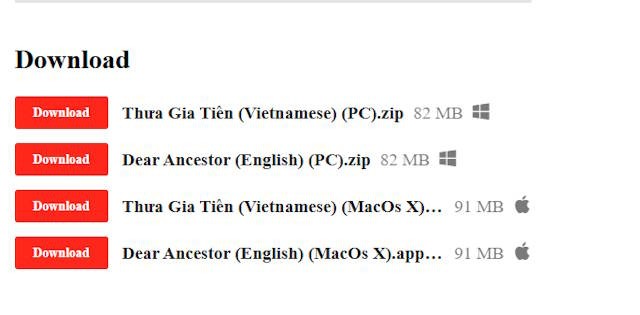 Bước 3: Hiện tại, game Thưa Gia Tiên cung cấp 4 phiên bản khác nhau: dành cho máy tính PC và MacOS, cùng với hỗ trợ ngôn ngữ tiếng Anh và tiếng Việt. Hãy chọn phiên bản phù hợp với hệ điều hành của bạn và nhấn vào nút Download.