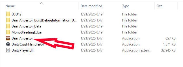 Chạy file thực thi của game, có tên là Dear Ancestor (loại file là "Application"), để bắt đầu trải nghiệm game mà không cần thực hiện cài đặt phức tạp.