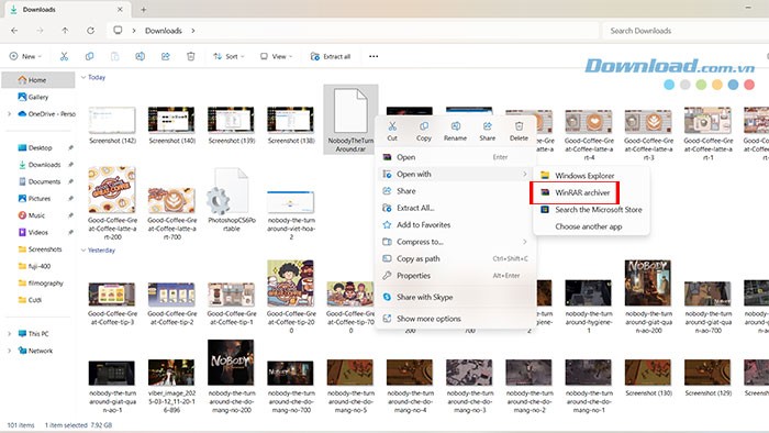 Bước 2: Sau khi quá trình tải xuống hoàn tất, hãy nhấp đúp chuột vào file NobodyTheTurnaround.rar. Tiếp theo, di chuột đến tùy chọn Open with và lựa chọn WinRAR Archiver để tiến hành giải nén file.