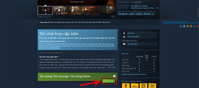 Bước 1: Truy cập trang web chính thức của game The Scourge - Tai Ương trên nền tảng Steam. Sau đó, cuộn xuống dưới và chọn nút Tải xuống ở phần tương ứng.