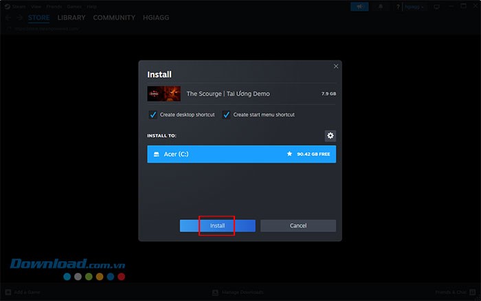 Bước 5: Khi ứng dụng Steam được khởi động, cửa sổ cài đặt trò chơi sẽ tự động xuất hiện. Lúc này, hãy nhấn nút Install để bắt đầu tải game Tai Ương.