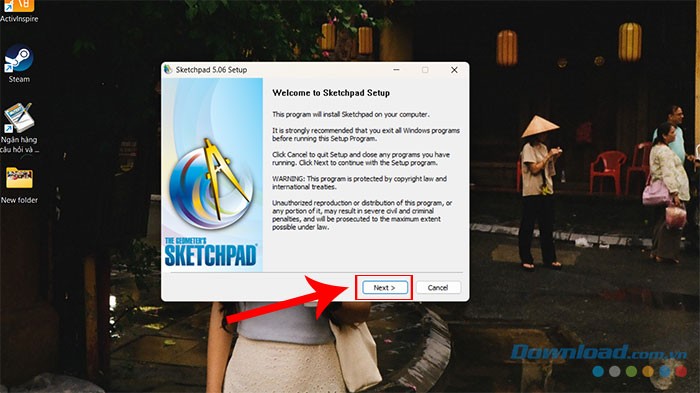 Bước 4: Chọn Yes để xác nhận việc bắt đầu cài đặt, sau đó nhấn Next trong cửa sổ Sketchpad 5.06 Setup.