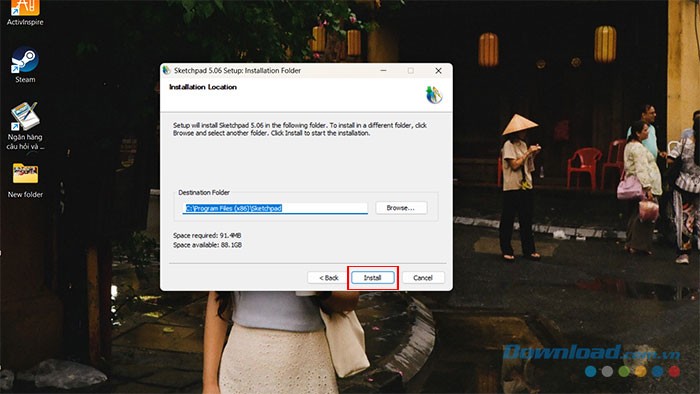 Bước 7: Chỉ định thư mục mà bạn muốn lưu các file cài đặt, sau đó nhấn Install.