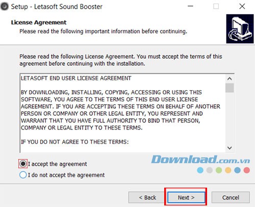 Bước 6: Đọc kỹ và chấp nhận các điều khoản sử dụng của SoundBooster bằng cách đánh dấu chọn vào ô I agree the agreement, sau đó nhấn Next.