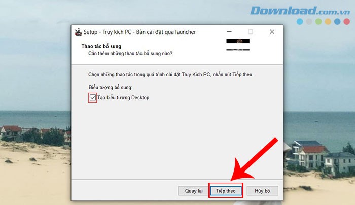 Bước 3: Nếu bạn muốn có một lối tắt nhanh chóng để truy cập trò chơi sau khi cài đặt, hãy đánh dấu chọn vào ô Tạo biểu tượng desktop. Tiếp theo, ấn nút Tiếp theo để chuyển sang bước tiếp theo.