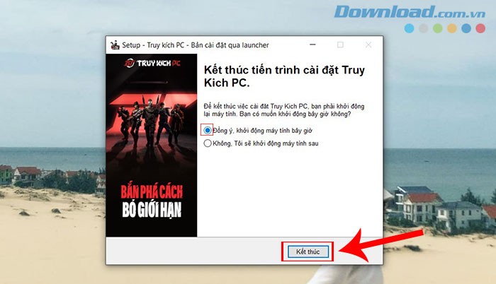 Bước 5: Lưu ý rằng, để hoàn thành việc cài đặt Truy Kích PC, máy tính của bạn sẽ cần được khởi động lại. Vì vậy, hãy chọn Đồng ý, khởi động máy tính bây giờ và nhấn Kết thúc để kết thúc quá trình cài đặt.