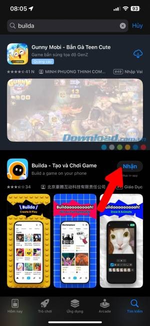 Bước 2: Nhấn vào thanh tìm kiếm và gõ tên ứng dụng. Sau đó, chọn nút Tải về để cài đặt ứng dụng Builda - Tạo và Chơi Game.