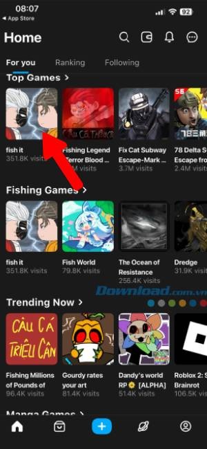 Bước 5: Trên trang chủ ứng dụng, tìm và nhấn vào game fish it trong danh mục Top Games hoặc Fishing Games.