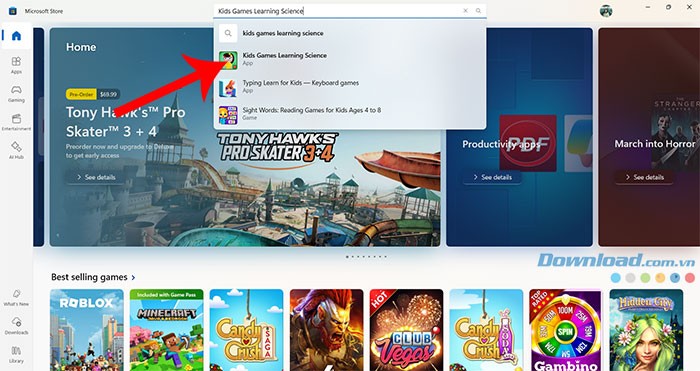 Bước 1: Người dùng có thể truy cập trang web để tải Kids Science Learning Games. Hoặc, bạn có thể mở ứng dụng Microsoft Store và thực hiện tìm kiếm ứng dụng này.