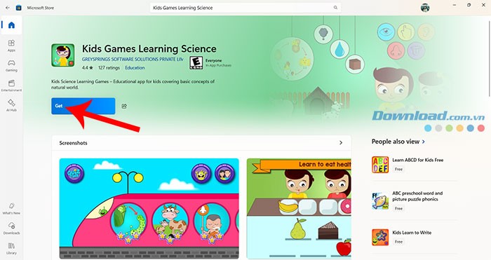 Bước 2: Trong trang tải Kids Science Learning Games, hãy nhấn vào nút Get để bắt đầu quá trình tải xuống. Quá trình tải ứng dụng có thể yêu cầu người dùng đăng nhập vào tài khoản Microsoft. Do đó, hãy đảm bảo bạn đã đăng nhập trước khi tiến hành tải.