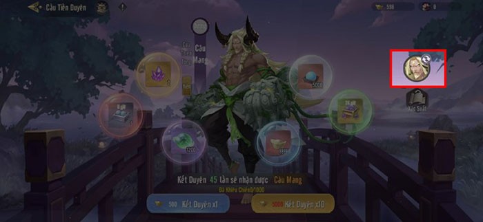 Tiếp theo, hãy quay trở lại mục Sự Vụ và chọn Cầu Tiền Duyên. Tại giao diện này, nhấn vào biểu tượng nhân vật nằm ở phía bên phải (phía trên mục Xác Suất).