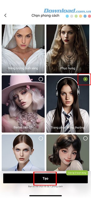 Bước 3: Hãy chọn một phong cách phù hợp cho ảnh đại diện AI của mình, có thể là ảnh hồ sơ, trang phục thường ngày, hoặc phong cách phục hưng,... Sau đó, nhấn Tạo để bắt đầu quá trình.