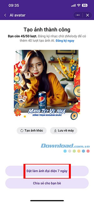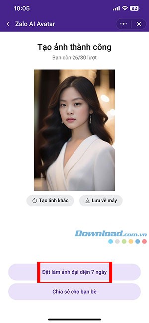 Nếu bạn đã ưng ý với kết quả, hãy nhấn Đặt làm ảnh đại diện 7 ngày, Chia sẻ với bạn bè hoặc Lưu về máy để chia sẻ với mọi người.