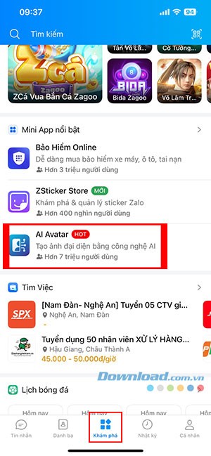 Bước 1: Truy cập Mini App AI Avatar trên Zalo bằng cách thực hiện các thao tác tương tự như trước. Bạn có thể nhanh chóng tìm thấy tính năng này bằng cách mở tab Khám phá và tìm kiếm AI Avatar trong danh mục Mini App nổi bật.