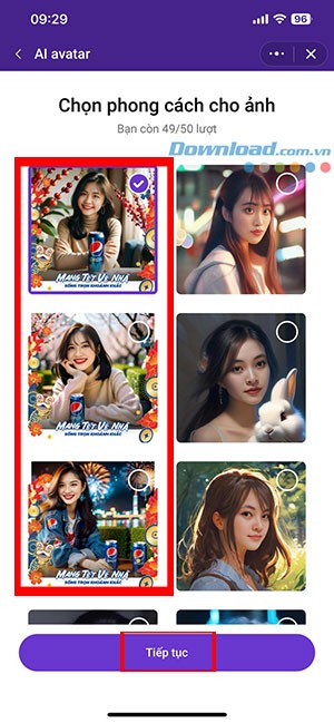 Bước 3: Lựa chọn phong cách thiết kế cho ảnh đại diện AI của bạn. Zalo cung cấp đa dạng các phong cách khác nhau. Để tạo avatar mang đậm nét Tết, hãy ưu tiên chọn một trong ba phong cách đầu tiên. Cuối cùng, nhấn Tiếp tục để tiến hành.