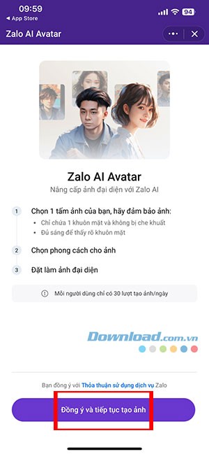 Bước 2: Sau khi mở Zalo AI Avatar, nhấn nút Đồng ý và tiếp tục tạo ảnh để chấp nhận các điều khoản sử dụng dịch vụ của Zalo.