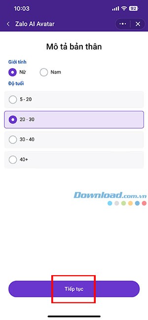 Bước 4: Sau khi chọn ảnh, hãy chọn Giới tính và Độ tuổi trong trang Mô tả bản thân, sau đó nhấn Tiếp tục.