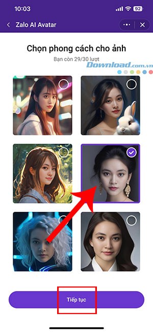 Bước 5: Chọn một trong 6 phong cách cho ảnh mà Zalo AI cung cấp và ấn Tiếp tục.