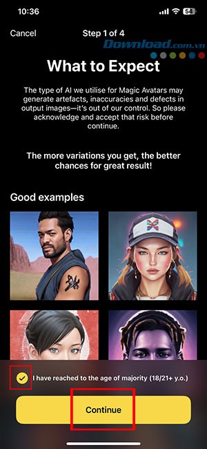 Bước 4: Ứng dụng sẽ yêu cầu bạn đồng ý với các điều khoản sử dụng, đồng thời đưa ra những cảnh báo liên quan đến các quy định về hình ảnh được phép. Sau đó, nhấn Continue (Tiếp Tục) để xác nhận.