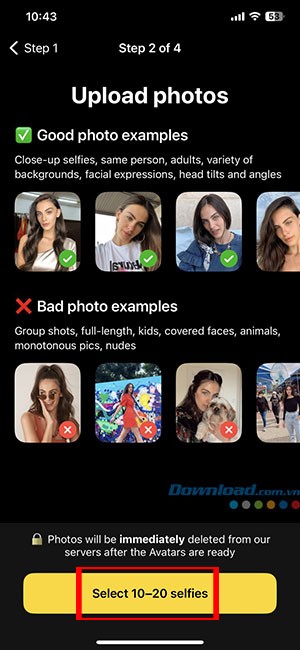 Bước 5: Chọn Select 10-20 selfies (Chọn 10-20 ảnh tự chụp) và tải lên những bức ảnh phù hợp. Lensa AI khuyến nghị sử dụng ảnh chụp cận mặt, ảnh của người trưởng thành, với nhiều phông nền và biểu cảm khác nhau. Tránh sử dụng ảnh chụp nhóm, ảnh trẻ em, ảnh che mặt hoặc ảnh khỏa thân.