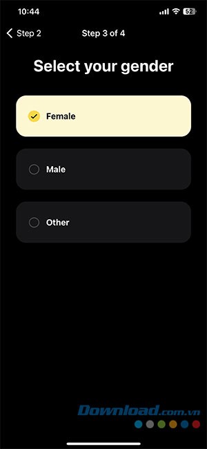 Bước 6: Xác định giới tính của bạn bằng cách chọn một trong các tùy chọn: Female (Nữ), Male (Nam) hoặc Other (Khác).