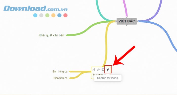 Việc thêm các biểu tượng sẽ giúp làm nổi bật các ý tưởng then chốt. Bạn có thể lựa chọn các biểu tượng có sẵn (ví dụ: nhấn vào biểu tượng sấm sét) hoặc tải lên hình ảnh riêng để tăng tính trực quan cho sơ đồ.