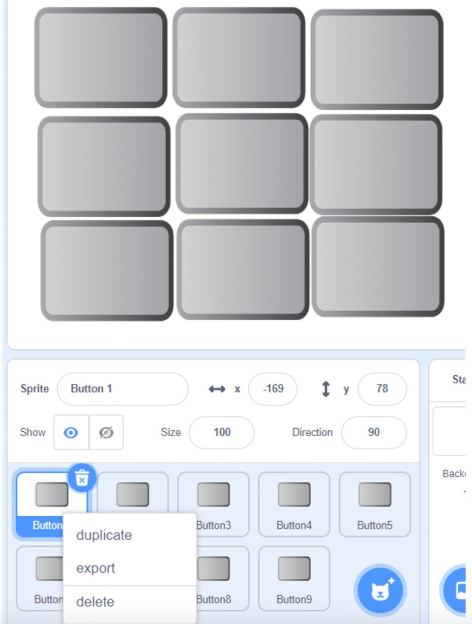 Để tạo ra 8 ô vuông còn lại, bạn chỉ cần nhấp chuột phải vào Sprite Button ban đầu và chọn "Duplicate". Lặp lại thao tác này cho đến khi có đủ 8 bản sao. Tiếp theo, sắp xếp chín ô vuông này thành một lưới 3x3, tạo thành bàn cờ caro hoàn chỉnh.