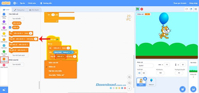 Quay lại mục Các biến số và chọn khối thay đổi biến của tôi một lượng 1. Sau đó, mở menu thả xuống và chọn Điểm số để trò chơi có thể tính điểm.