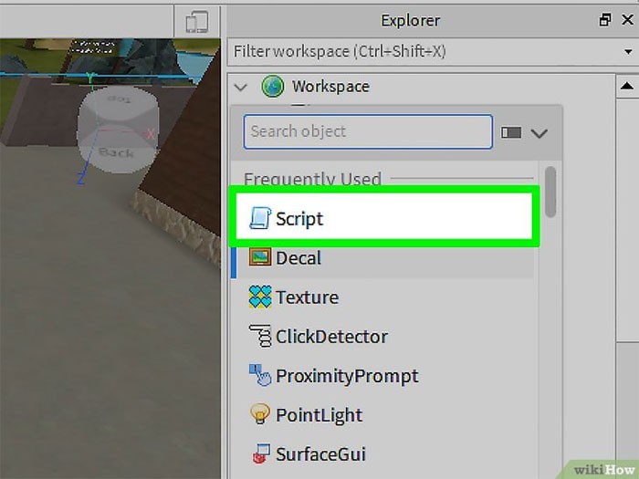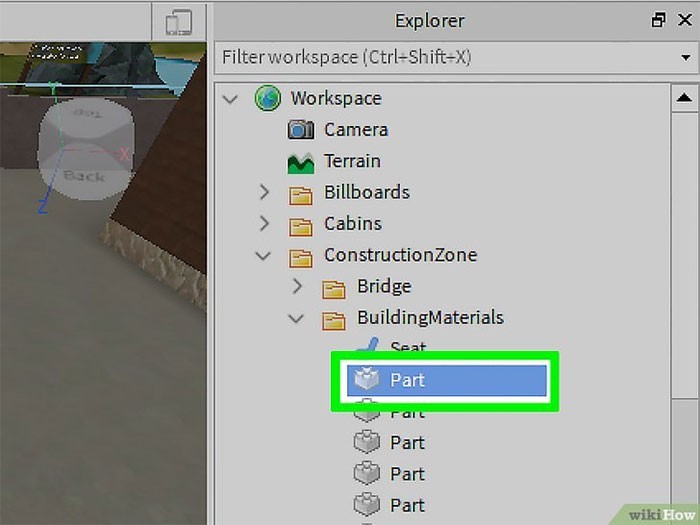Bước 3: Trong bảng Explorer, điều hướng đến đối tượng mà bạn muốn gắn script vào. Workspace là nơi chứa toàn bộ môi trường trò chơi.